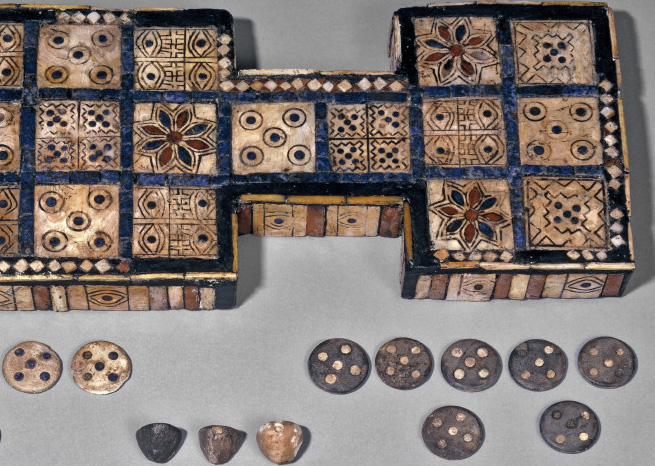 The Ur-style Twenty Squares game board was also known in Egypt as ‘Asseb’, and has been found in Pharaoh Tutankhamen’s tomb, among other places. Discovery of a tablet partially describing the game play has allowed the game to be played again after over 2000 years, although reconstructions of the detailed rules have differed widely.